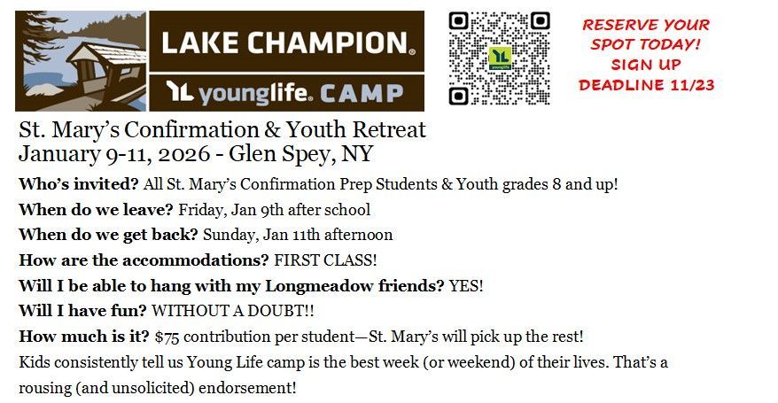 YoungLife & WyldLife Summer Camp at the lake - Join our youth ministry leaders for THE BEST WEEK OF SUMMER at Saranac Lake for high schoolers and Lake Champion for middle schoolers. Reserved spots fill up fast; email smcdonald@stmarylong.org for more info.